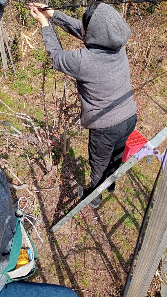 ブルーベリーの郷です。この日は、真理子と二人で防鳥ネットを張りました。 支柱に、ガイドのタフロンテープを張り、その上にネットを渡します。二人揃って脚立の作業です。 私が少し高い脚立に乗り網を持ち上げ、少し低い脚立で真理子が網を留める。 モグ...