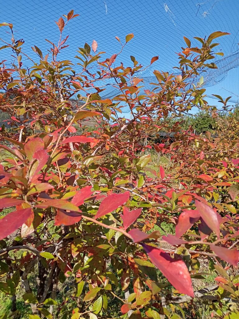 ブルーベリーの郷です。 寒暖差が激しいですね。日中は汗をかき、畑から引き上げる頃はヒンヤリします。 ブルーベリーの葉っぱも紅葉が始まりました。 気持ちの良い季節ですね。